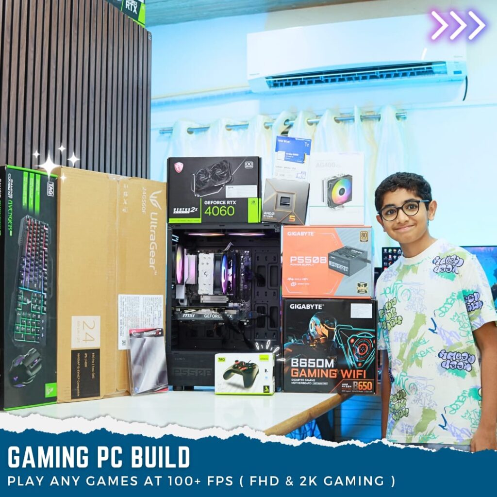Balanced Gaming & Coding PC Build powered by AMD Ryzen 5 Processor and ASUS Dual RTX 4060 8GB, paired with MSI B650 motherboard and Cooler Master MWE Bronze 550W PSU. Designed for smooth 1080p high-FPS gaming, programming, online classes and productivity tasks.